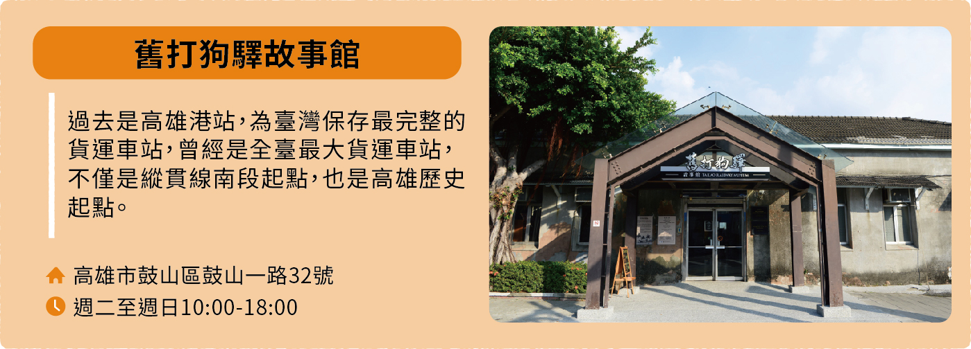 現存的哈瑪星鐵道園區即為日治時期的打狗驛,作為高雄第一座火車站,成為砂糖與各種物資進出台灣的中繼站,是高雄市百年城市發展的重要起點。1941年客運站搬遷之後,繼續以高雄港驛之名服務貨物運輸,直至2008年因配合市區鐵路地下化計畫而停用。