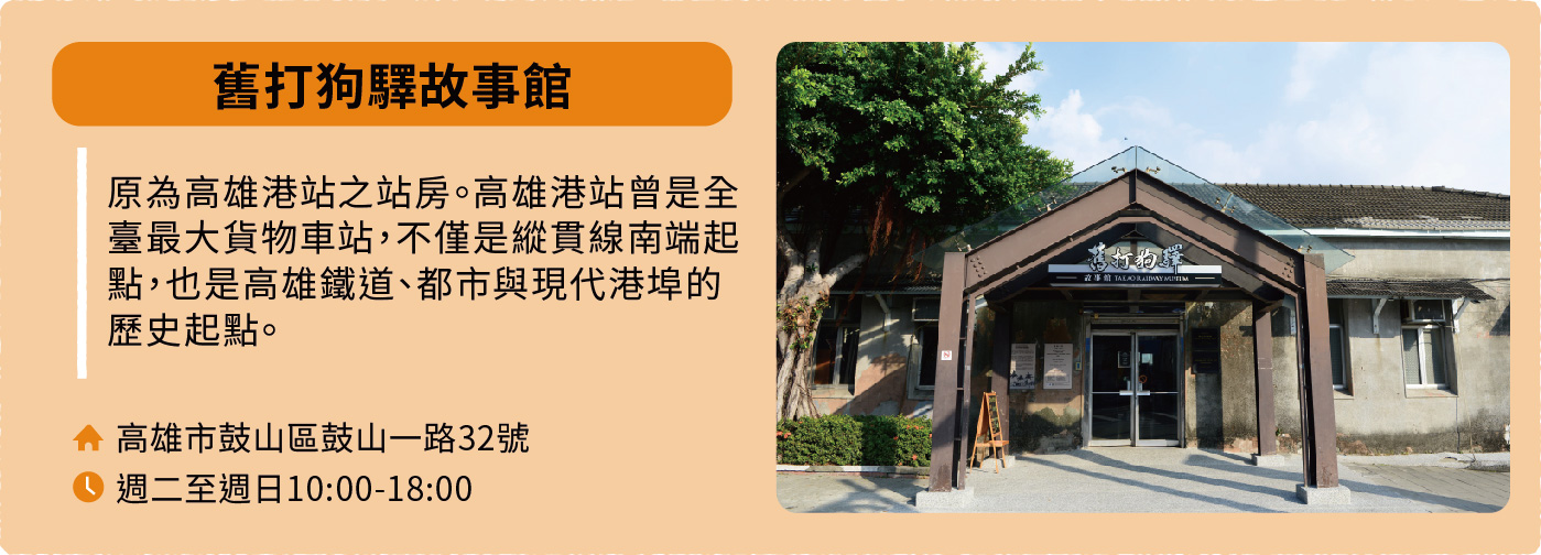 現今的哈瑪星鐵道園區即為日治時期的打狗驛,作為高雄第一座火車站,成為砂糖與各種物資進出台灣的中繼站,是高雄市百年城市發展的重要起點。1941年客運站搬遷之後,繼續以高雄港驛之名服務貨物運輸,直至2008年因配合市區鐵路地下化計畫而停用。